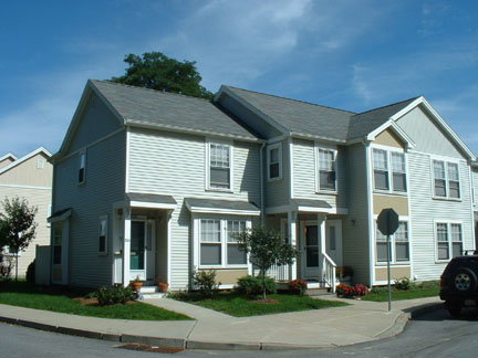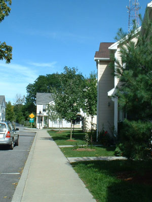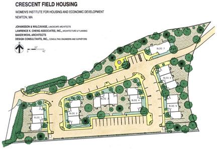 Our objectives were to create an identifiable neighborhood that would continue the residential character of Crescent Street and to maximize green space with diversified planting. Each housing unit has its own front and back yard with a gathering space on site for the entire complex. A new street was developed with on-street parking and direct access to all the units. Since this site borders the Mass Turnpike, a sound barrier was constructed between the highway and housing site.