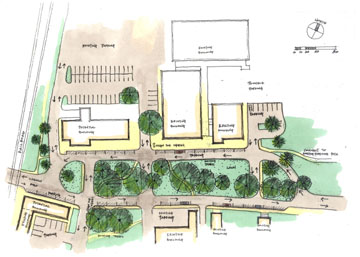 Johansson’s plan illustrated how the existing main street could be converted to a New England Town Green by splitting the traffic flow one way into the existing unattractive mall parking lot and widening an existing area of large trees. In addition to the aesthetic improvements, the plan resolved several of the towns problems: a Town Green would link the commercial areas, encourage pedestrian circulation, improve the sense of arrival to the downtown area, slow traffic through town and increase the retail curb appeal.